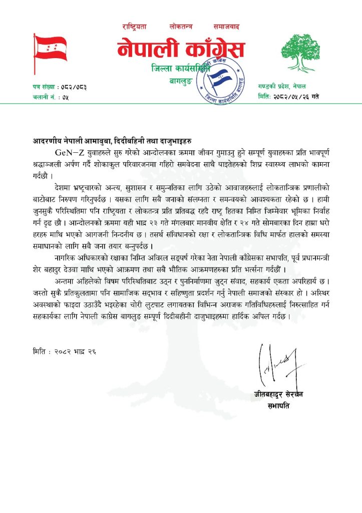 नेपाली काँग्रेस बागलुङले लोकतान्त्रिक विधिमार्फत समस्याको समाधान खोज्न आग्रह गरेको छ । नेपाली काँग्रेसका सभापति जीतबहादुर शेचरनले बिहीबार एक विज्ञप्ती जारी गर्दै संविधानको रक्षा र लोकतान्त्रिक विधि मार्फत हालको समस्या समाधानको लागि सबै जना तयार बन्नुपर्ने उल्लेख गरेका छन् । जारी विज्ञप्तीमा जेनजी युवाहरुले सुरु गरेको आन्दोलनका क्रममा जीवन गुमाउने सम्पूर्ण युवाहरुकाप्रति भावपूर्ण श्रद्धाञ्जली अर्पण गर्दै शोकाकुल परिवारजनमा गहिरो समवेदना साथै घाइतेहरुको शिघ्र स्वास्थ्य लाभको कामना गरिएको छ ।
