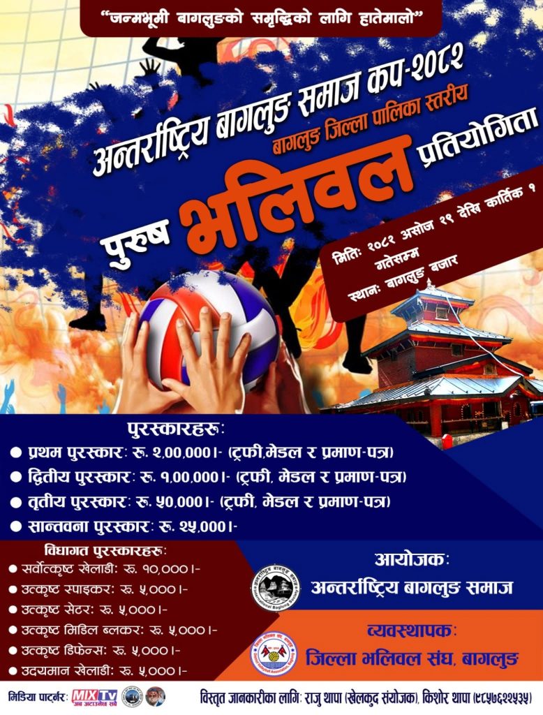 अन्तर्राष्ट्रिय बागलुङ समाजले बागलुङ जिल्ला पालिकास्तरीय पुरुष भलिबल प्रतियोगता आयोजना गर्ने भएको छ । बागलुङ जिल्लाका १० वटै पालिकाबाट टिम सहभागी गराए आगामी असोज २९ गतेदेखि कात्तिक १ गतेसम्म प्रतियोगिता गर्न लागेको अन्तर्राष्ट्रिय बागलुङ समाजका अध्यक्ष गंगा शर्माले बताए । युवाहरुलाई खेलकुद क्षेत्रमा आकर्षित गर्ने खेलकुदलाई पनि आयआर्जनको क्षेत्रको रुपमा विकास गर्ने उद्देश्यले प्रतियोगिताको आयोजना गरेको उनले बताए ।