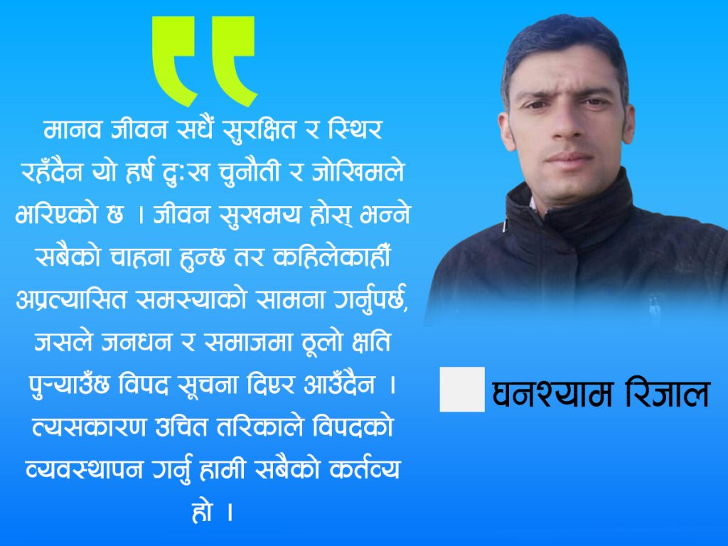 मानवीय वा प्राकृतिक कारणले हरेक वर्ष नेपालमा दुखद घटना हुँदा सयौं मानिसले जीवन गुमाउनु परेको छ समाजको विकासक्रमसँगै हाम्रो दैनिक जीवनमा जोखिम बढिरहेको देखिन्छ हाम्रा पुर्खालाई प्राकृतिक जोखिम भएपनि मानवीय जोखिम भने कम थियो। किनकि त्यो बेला भौतिक आर्थिक र सामाजिक पूर्वाधारहरूको राम्रो विकास हुन सकेको थिएन जति समाज विकसित हुँदै जान्छ त्यति नै जोखिमको सम्भावना बढ्दै जान्छ । हामीले प्रयोग गर्ने उपकरण वा हामीले काम गर्ने कम्पनी, चलाउने साधन आदिमा जोखिम बढ्दै गएको छ। जलवायु परिवर्तन का असरहरुले भविष्यमा विपन्न देशलाई ठूलो खतरा हुने अनुमान गरिएको छ। किनभने धेरैजसो विपतहरू मौसमजन्य कारणले हुने गरेका छन्। तर विपत जोखिमलाई सबैले प्रयास गरे कम गर्न सकिन्छ।